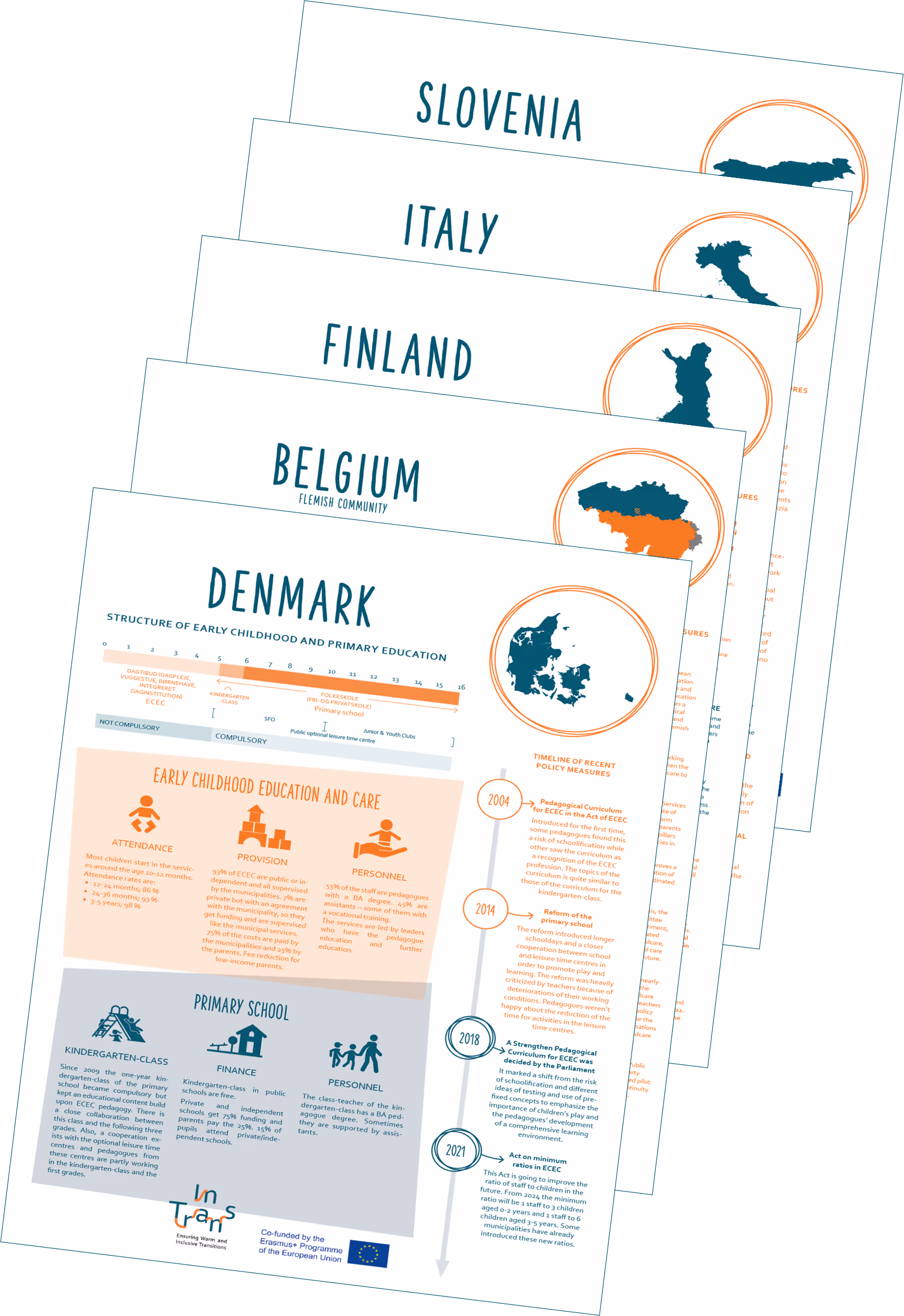 More concretely, the project has conducted policy analysis research in each of the four countries involved (Belgium, Finland, Italy and Slovenia). Based on the resulting baseline policy country reports, these infographics have been created to provide an overview of the present state of early childhood care and education systems in the countries (including Denmark).