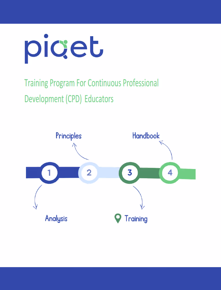 This document provides a model for a three-day training based on PIQET Principles but it leaves enough room for personal, organisational or national differences. The program can be used by individuals, CPD educators of any type willing to reflect on their own work and improve it, or by CPD providers, public or in-service non-governmental organisations willing to put in place policies of quality assurance in recruitment and support to CPD educators. In practical use, it is designed as a three-day training. However, organisations or individuals using it can adopt it to serve their specific needs by modifying this structure.