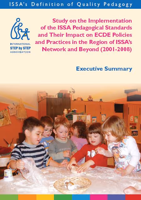Study on the implementation of ISSA's Pedagogical Standards (2001-2008) was developed to evaluate the impact of the work done by ISSA members in 27 countries on quality assurance and improvement. The study examines the role of the ISSA Pedagogical Standards (2003) as they were implemented through certification, mentoring, training and as part of broader initiatives for improving quality of preschool and primary school care and education. The results of the study showcase how the ISSA Standards influenced changes on different levels : individual teacher practice, level of educational institutions, community culture, and national policy. The study also includes case studies, best practices and lessons learned across the ISSA network.