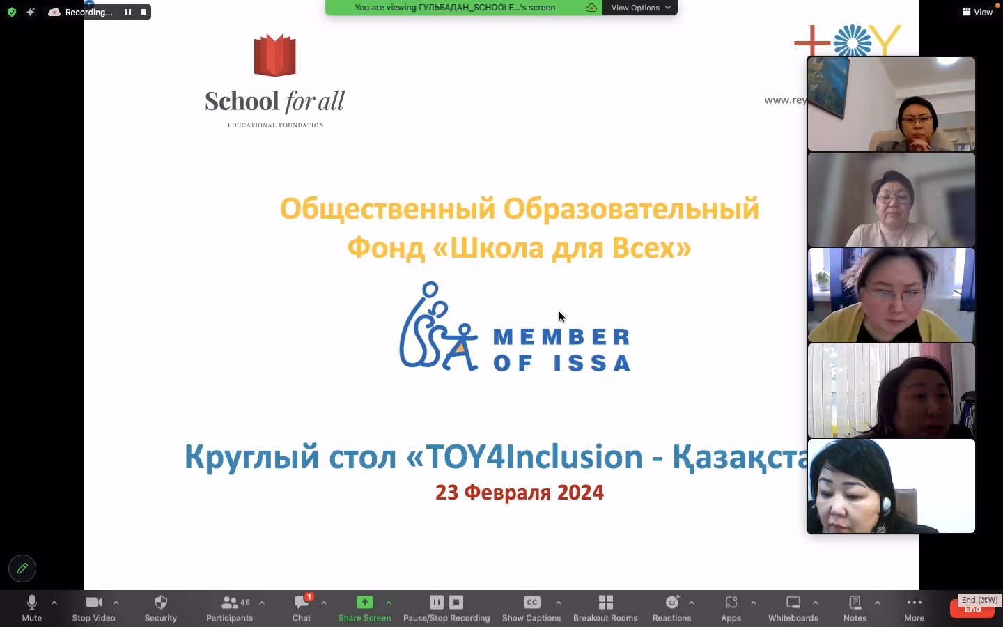 On February 23, 2024, a landmark event in Kazakhstan's commitment to inclusive education and community integration took place through an online round table entitled "TOY4 Inclusion – Kazakhstan". This crucial gathering, hosted by the ISSA member organization Community Educational Foundation "School for All", was dedicated to assessing the needs for the TOY for Inclusion approach, evaluating existing similar initiatives, and fostering engagement with key stakeholders.